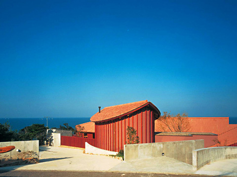 太平洋の黒潮に合う色合いを意識したうえに船型の屋根を板葺きのイメージに納めたサロン棟の重ね葺き海椿瓦と同じ色合いで作られた客室棟の特注切落56判和形瓦。太陽の角度や天候によって見せる色の表情を変える艶消しの優しい色合いの瓦。「陶器」製品紹介へ